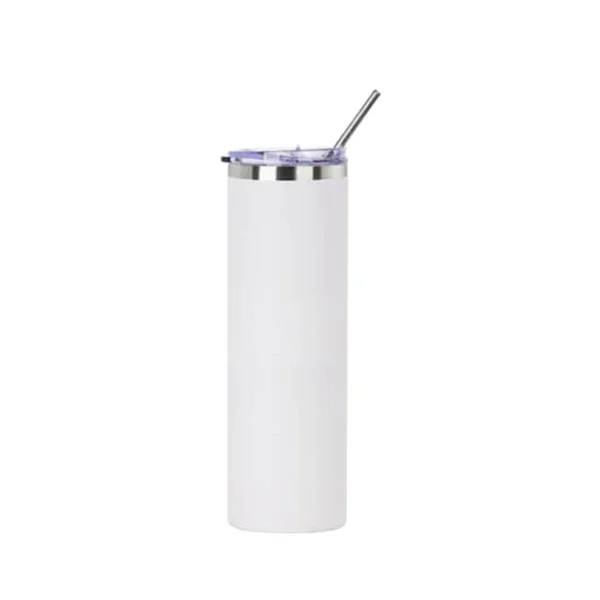 Tumbler-Trinkbecher aus rostfreiem Edelstahl mit Trinkhalm und transparentem Verschluss aus Kunststoff.